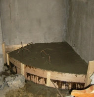 Bednění odstaněno, základ uspokojivý. Trochu betonu mi vyteklo mezerou mezi podlahou a ohnutým čelním bedněním - příště po obvodu nasypu jemný písek, abych pak neměl tolik práce s čištěném podlahy.